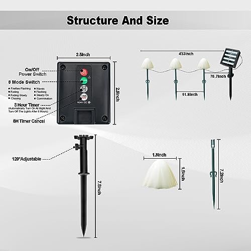 - [MULTIPLE LIGHTING MODES]Mushroom solar lights have 8 lighting modes:combination,fireflies flashing,waves, Fading,Fading slowly, Flashing,Steady on,Chasing, make your garden more beautiful and dreamy.
